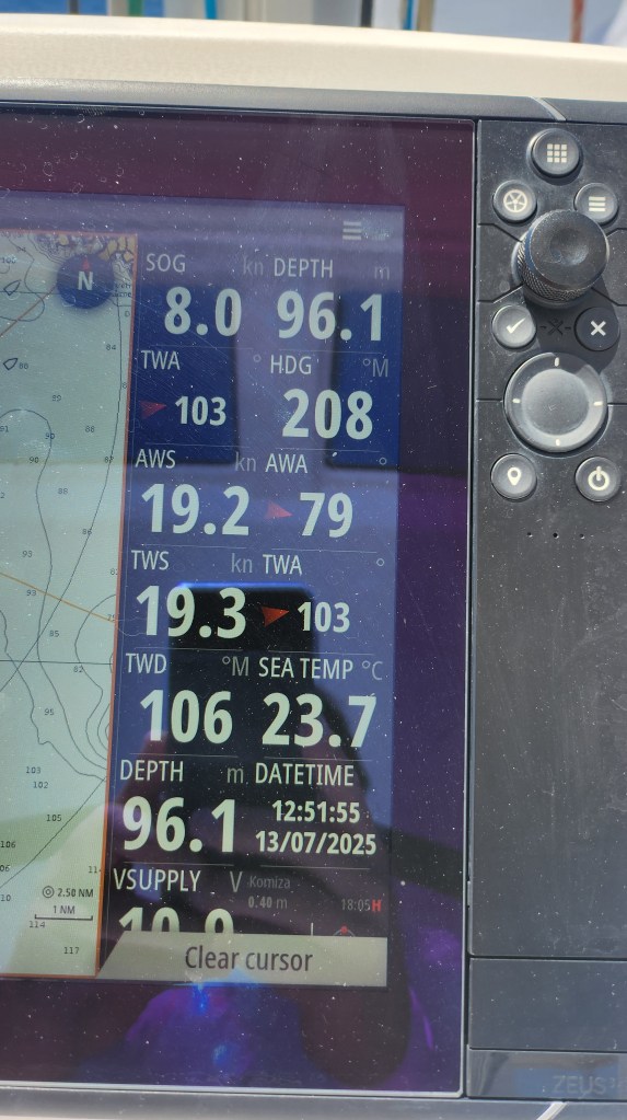 Later in the day we set off to circle the island and moved to a well-protected bay on the east side of Vis for the night. The forecast called for strong overnight winds, and it was absolutely the right call — the gusts climbed over 35 knots even inside our supposedly sheltered anchorage.