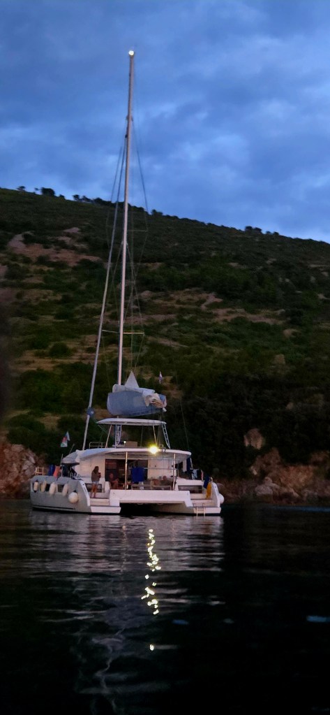 It was a calm and peaceful anchorage. We swam, watched the sunset from the water, and ended the day with a relaxed dinner on board.