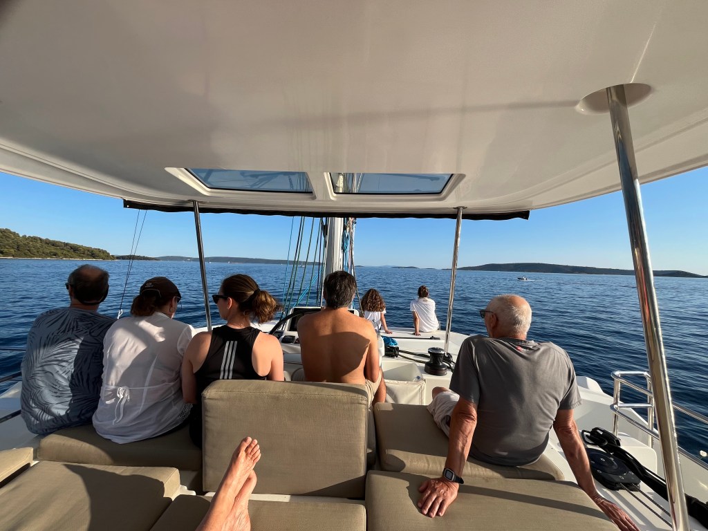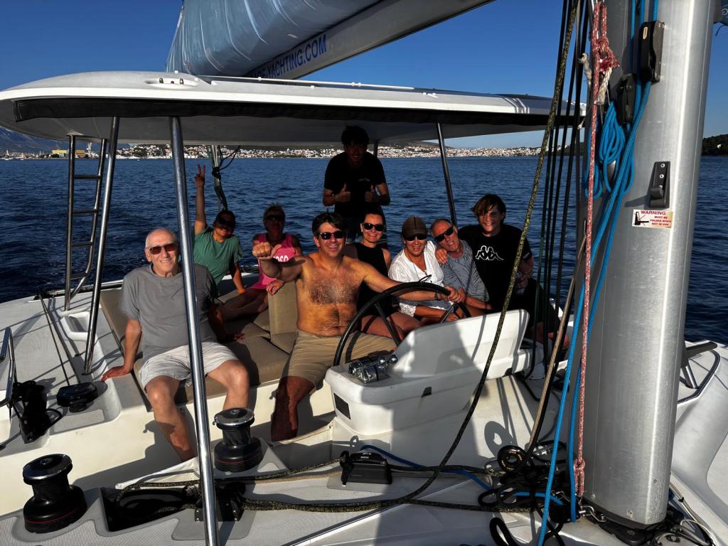 We decided to refill the diesel tanks in Milna, which turned into quite an experience. We spent about an hour waiting our turn in a line of boats, all drifting around in the wind, wakes, and current — not exactly a relaxed situation, and definitely a good test of the captain’s boat-handling skills. In the end it was just a long, uneventful wait, and once we were fueled up, we pointed the bow back toward Trogir. The day started with very light wind, but it picked up steadily, and by the time we reached the marina we had a solid 25-knot breeze. Docking a 50-foot catamaran in those conditions was another challenge, but the crew did an amazing job and we nailed it on the first attempt without any drama.