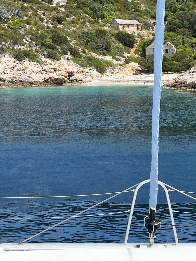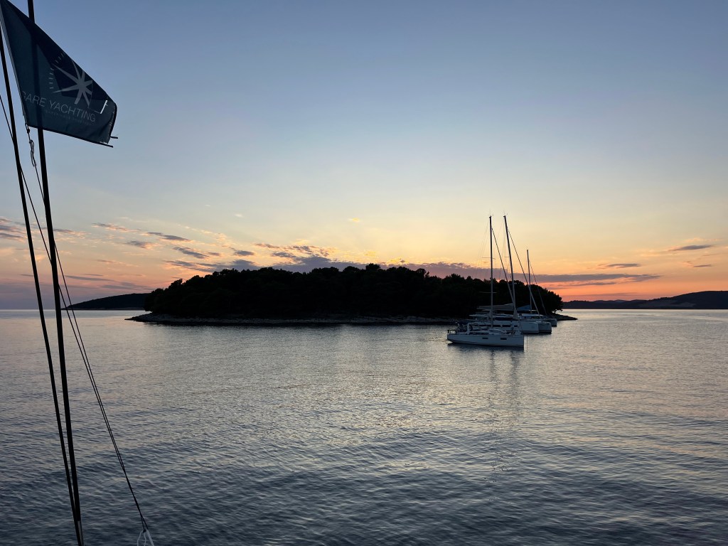 When we reached the Pakleni Islands, we picked a pretty little bay for the night and tried our first Mediterranean mooring: dropping the anchor at the bow and tying the stern lines to rocks on shore. It’s not exactly a beginner-friendly maneuver, especially with Croatia’s rocky seabed that makes it hard to get the anchor to really bite, but after a bit of effort we got set and were rewarded with another magical evening.